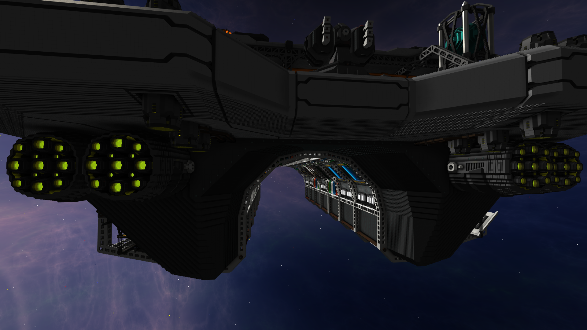 - finally, the ship components descend on a cargo elevator to a small hangar, from where utility craft can either build them into a vessel in the shipyard, or send them further down to a freighter hangar (outbound flights could ship out the excesses to be sold elsewhere)