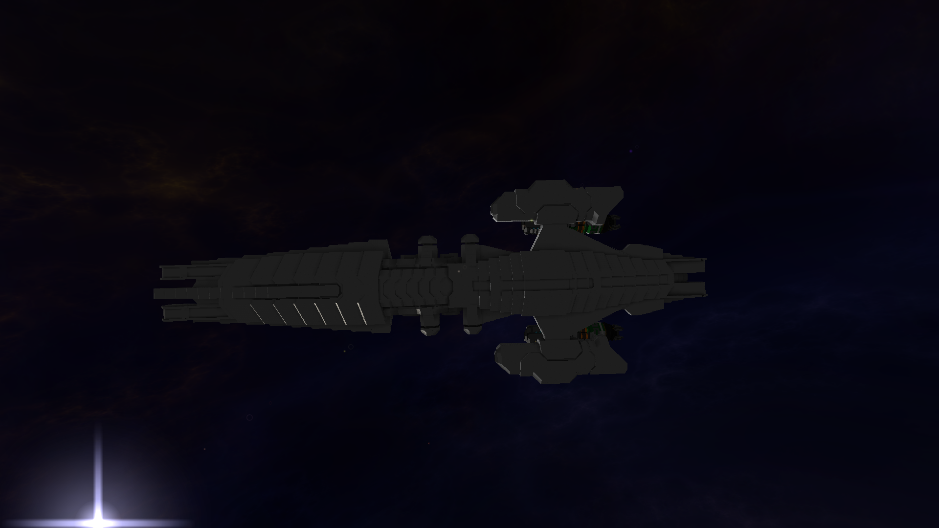I have no name for the ship yet, or images of what the back half will look like since I deleted the miniature model before taking and screenshots. But what I can tell you is that it will likely be around 700 - 800m long when completed. POssibly longer. Anyway, that's all for now. Thanks for reading~