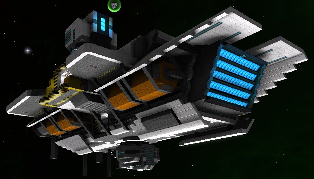 I just added my Star Axis styling to it instead of Cardassian. In this model, the outer hull is the weapon; it rotates around a central spherical core which can float alone like a ship or be docked to a single station block with a basic rail on it. I must say; a google search reveals that the Halo version looks a lot cooler than what's on Star Trek.
