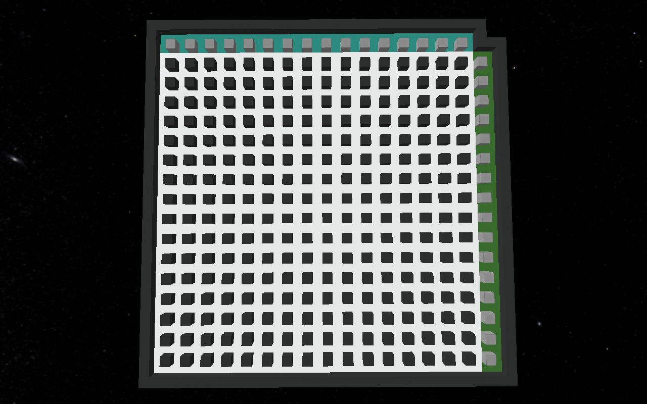 When activated with R, a processor opens a GUI interface. Along the top are 16 inputs. Along the side are 16 outputs. The center is a grid of points 16 points by 16 points, with the inputs and outputs forming an extra row at the top and an extra column at the side. (Yes, I drew it with blocks. Deal with it. The inputs and outputs should be numbered.)