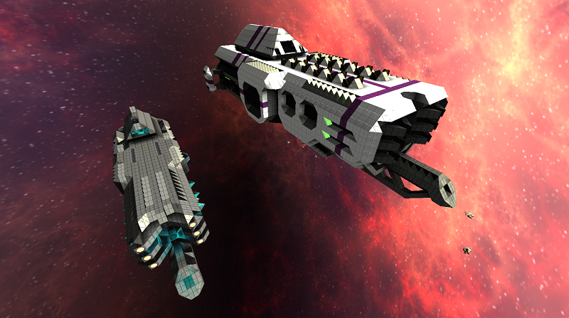 Well... I just can't put my finger on it, but the first frigate had to go. Actually, there is a bug with the effects right now where they don't work. Some message says 'firing with inactive ion effect'. So the first frigate is loaded with useless effect modules. It's also small for a frigate... So I made its slightly bigger replacement. I present, the assault frigate: Loaded with 12 vertical launch tubes and a soon to be installed beam cannon, it's got some stopping power for a ship it's size. Has a bigger interior too! I also 'painted' it with the white and purple detailing I think I'll use on the mothership. I figured white is neutral and purple is a combo of the blue and red lighting I'm going to install... What do you think of the colors?