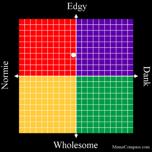 Really makes you thinkhey guys someone made a meme compass test like that political compass test thing. its probably not a accurate measurement of your taste in memes, hell you guys might even find it cringy but I found it at the very least amusing. Meme Compass